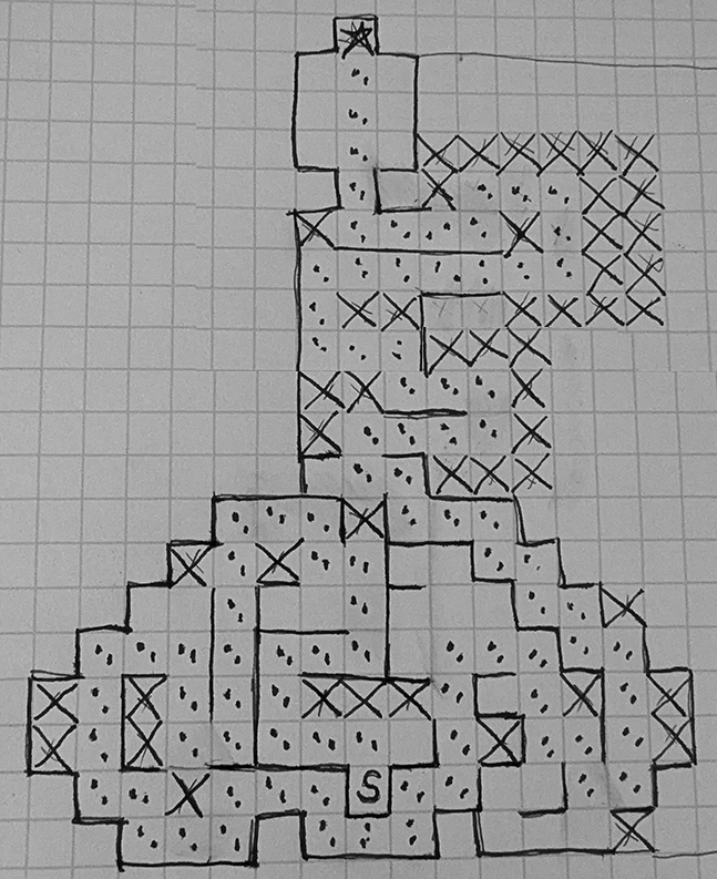 It’s done! I just finished uploading my EpicMegaJam submission a whole day early. I accomplished what I set out to do at a basic level. You’re an adventurer, cursed to map out this dungeon by face-checking every trap. Only by dying over and over again can you map out the safe path through this maze. Ideally you’re going to want to map it out on graph paper like I did. (Scroll to the bottom for the final solution)